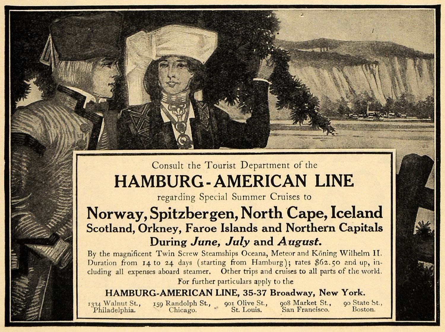 This is an original 1908 black and white print ad for the Hamburg-American Cruises from Hamburg-American Line, often referred to as Hamburg Amerikanische Packetfahrt Actien Gesellschaft, Hamburg-Amerika Linie, or Hamburg Line.