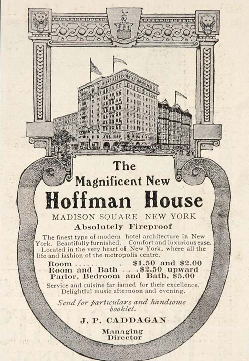 This is an original 1908 black and white print ad for the Hoffman House Hotel, Madison Square, New York with the room prices --$1.50 and up! J. P. Caddagan, Managing Director.