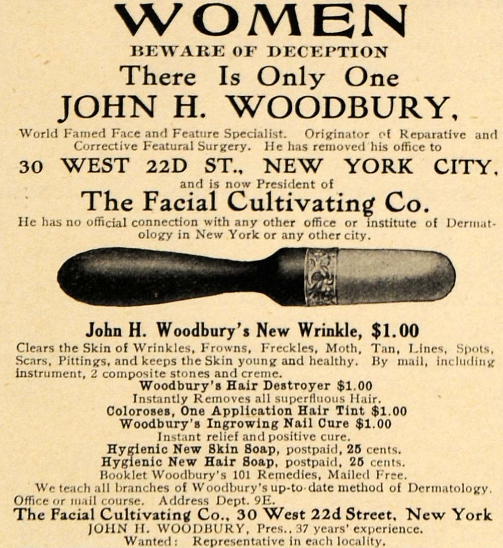 Woodbury's. In 1870, The John H. Woodbury Company was established in Albany, New York. The Andrew Jergens Company bought the soap business in 1901, and moved it to Cincinnati, Ohio. While soap was The Woodbury Soap CompanyÕs primary product, it also produced such items as cold cream, facial cream, facial powder, after-shave talc and ear swabs.