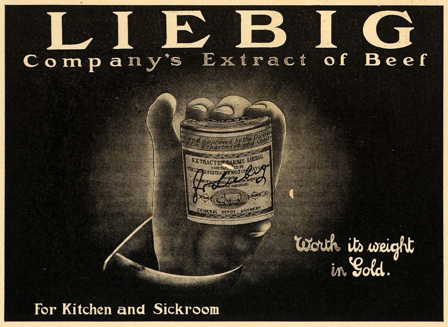 This is an original 1908 black and white print ad for Liebig Company's Extract of Beef for the Kitchen and Sickroom.
