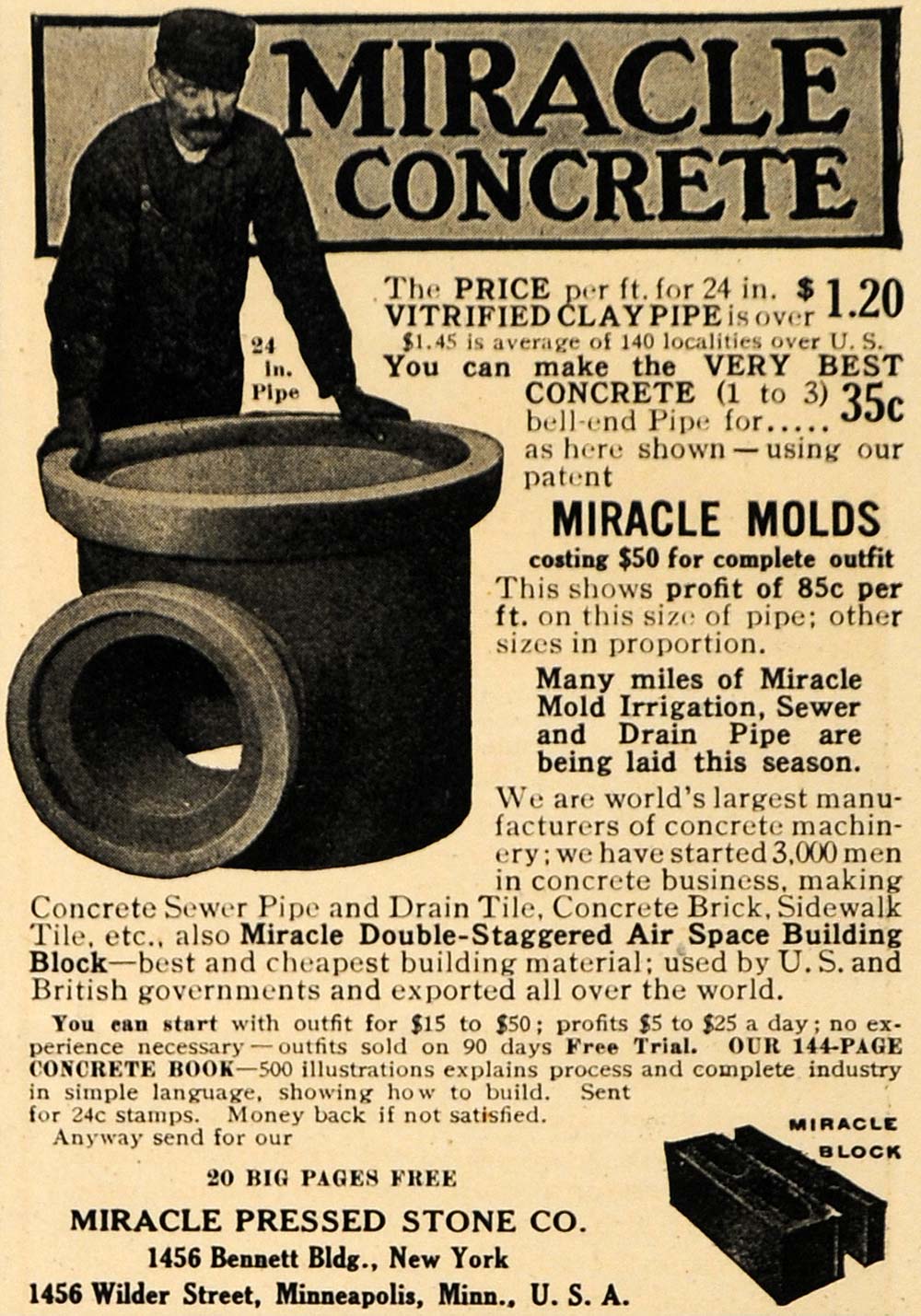 This is an original 1908 black and white print ad for the Miracle Pressed Stone Company, located at 1456 Bennett Building in New York and 1456 Wilder Street in Minneapolis, Minnesota. This ad features their Miracle Concrete, Vitrified Clay Pipe, Miracle Molds, Mold Irrigation, and Sewer and Drain Pipe.
