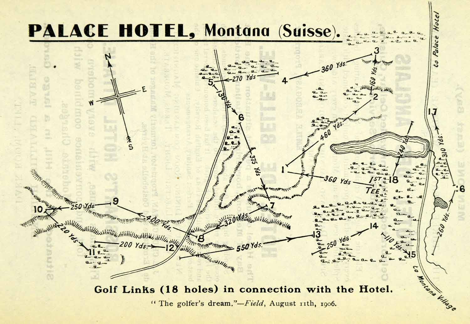 This is an original 1908 black and white print ad of the layout of the golf course connected to the Palace Hotel in Montana, Switzerland.