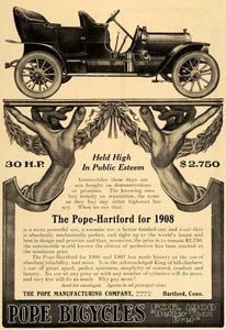This is a beautifully illustrated original 1908 black and white print ad promoting the Pope-Harford car from Pope Manufacturing Company located in Hartford, Connecticut.