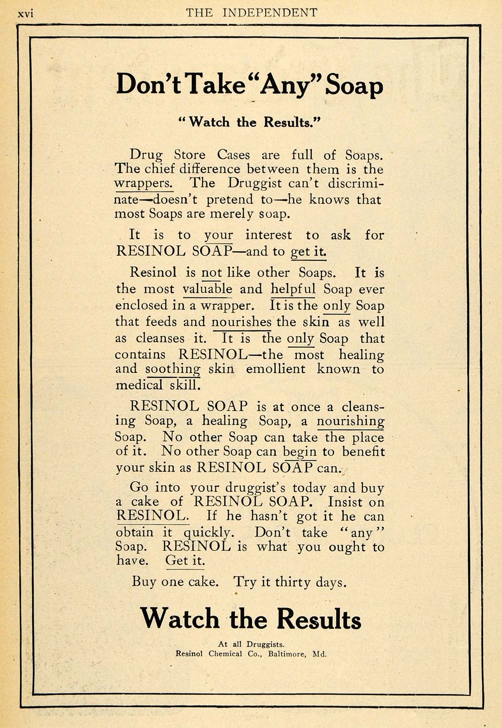 This is an original 1908 black and white print ad for the Resinol Soap from Resinol Chemical Company located in Baltimore, Maryland.