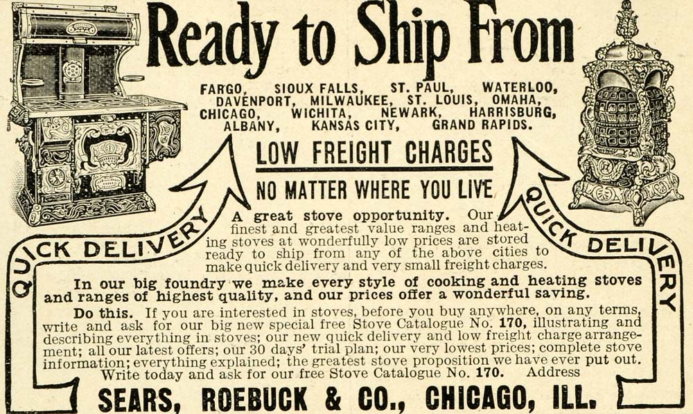 This is a small original 1908 black and white print ad for an oven from Sears, Roebuck & Company of Chicago, Illinois.