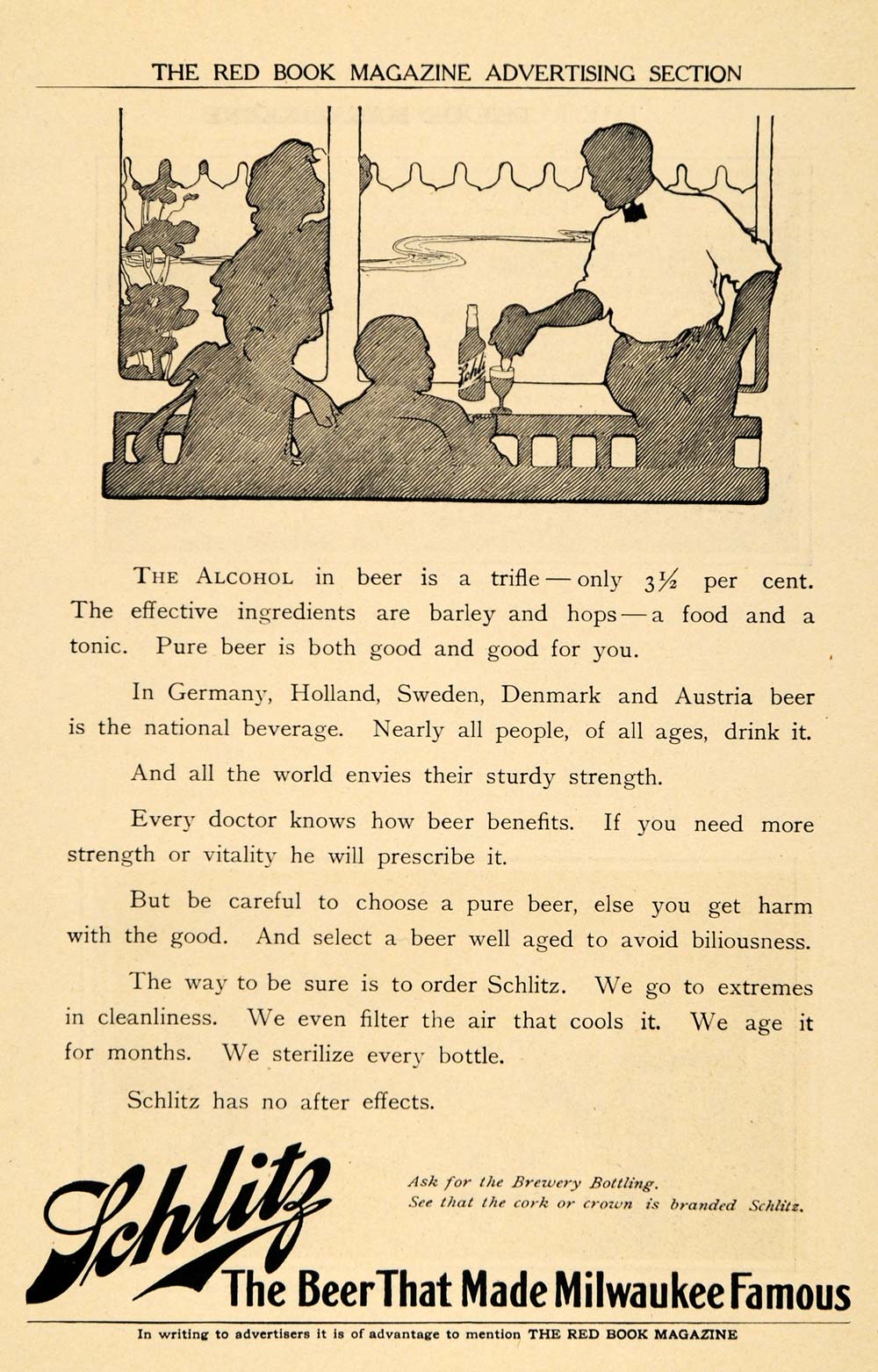 This is an original 1908 black and white print ad for Schlitz, "The Beer That Made Milwaukee Famous."