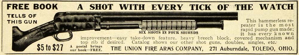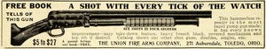 This is a tiny original 1908 black and white print ad for The Union Fire Arms Company, located at 271 Auburndale in Toledo, Ohio.