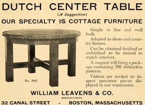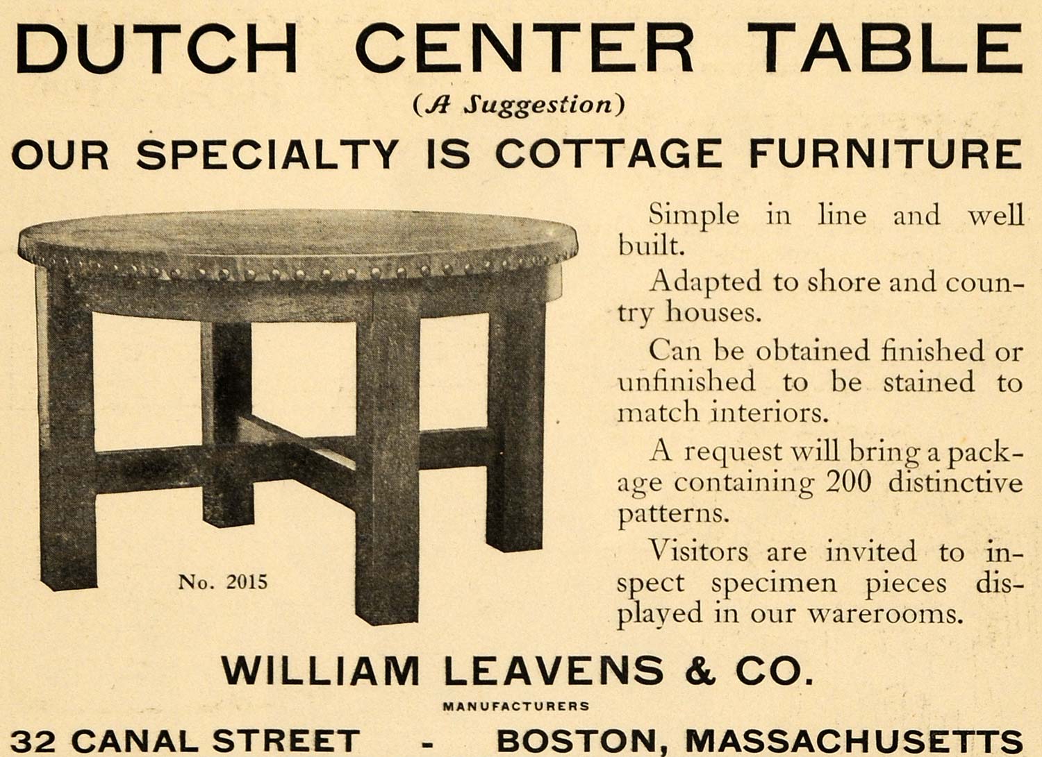 This is an original 1908 black and white print ad for William Leavens & Company, located at 32 Canal Street in Boston, Massachusetts. This ad features their Dutch Center Table, one furniture piece amongst their large cottage furniture collection.