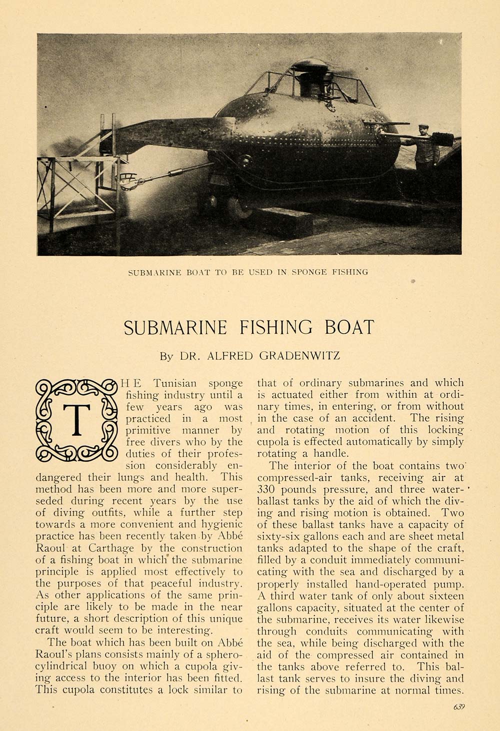 This is an original 1908 2 page (1 double-sided page) article by Dr. Alfred Gradenwitz on a submarine boat that was to be used in sponge fishing. Please see additional image.