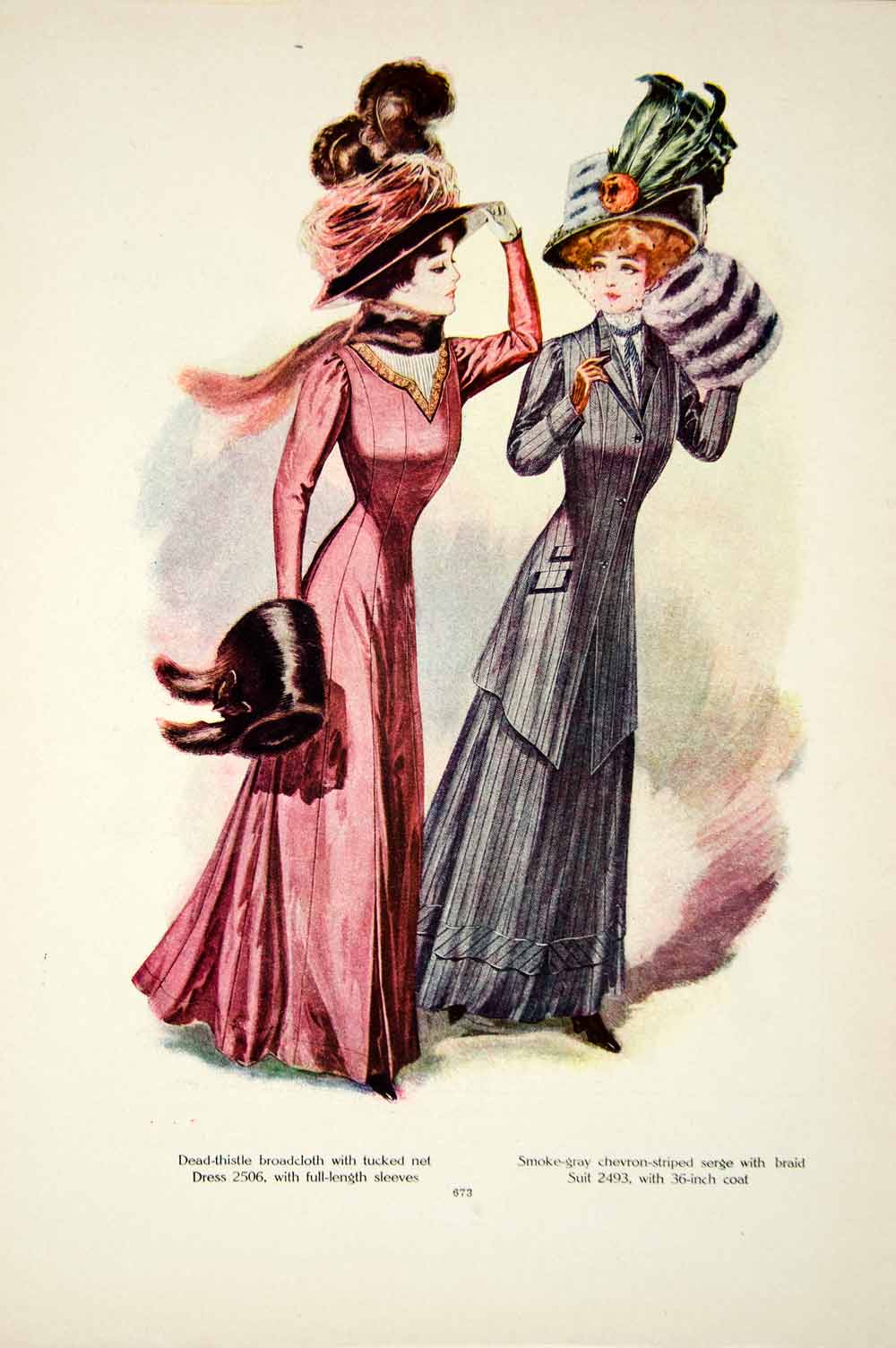 This is an original 1908 color print depicting two fashionable Edwardian women.