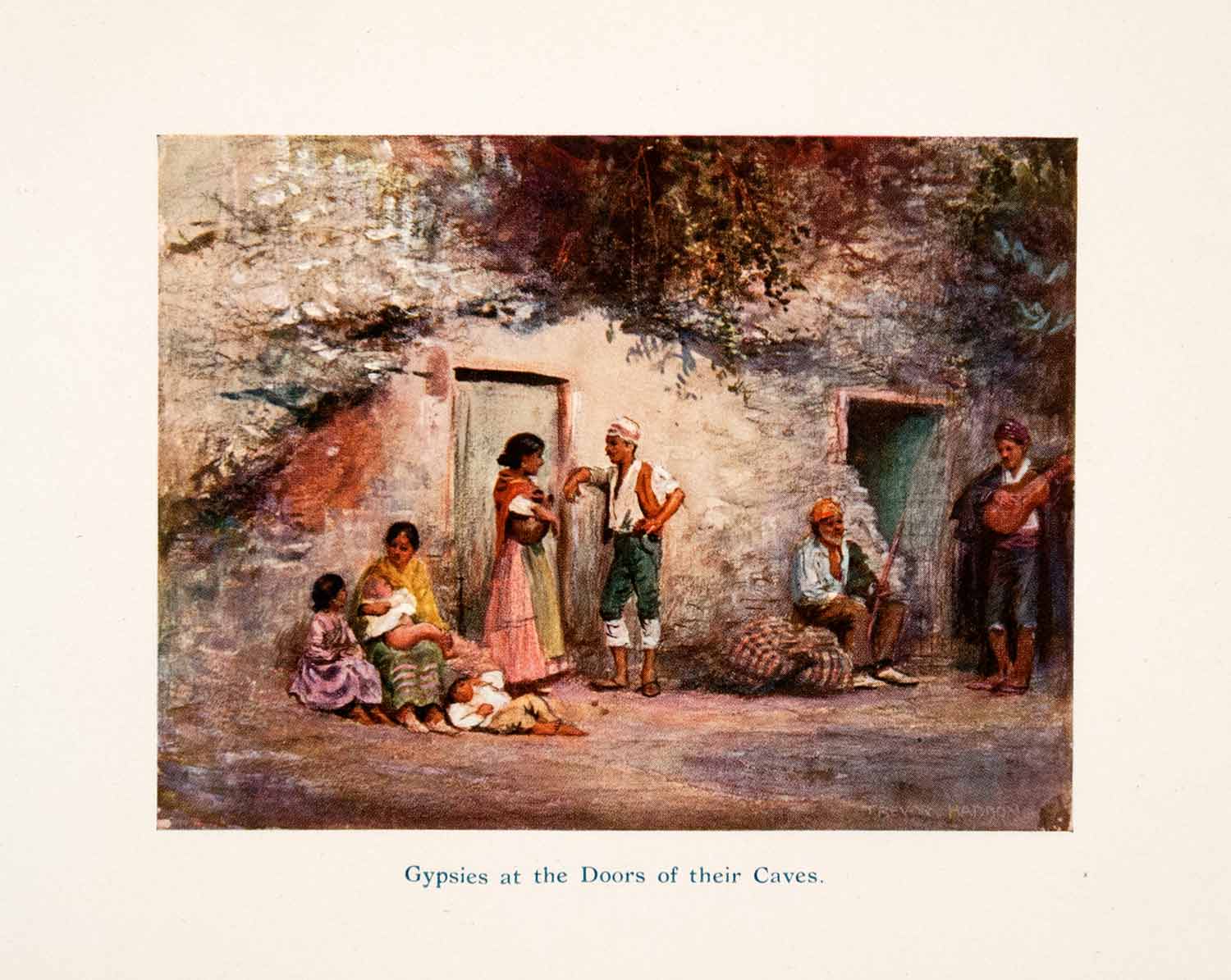 This is an original 1908 color print of an illustration by Trevor Haddon of gypsies standing outside the doors of their caves in Granada, Spain. When Gypsies first migrated to Spain, they were accepted, but later were prosecuted and assimilated because they were a non-Christian group.