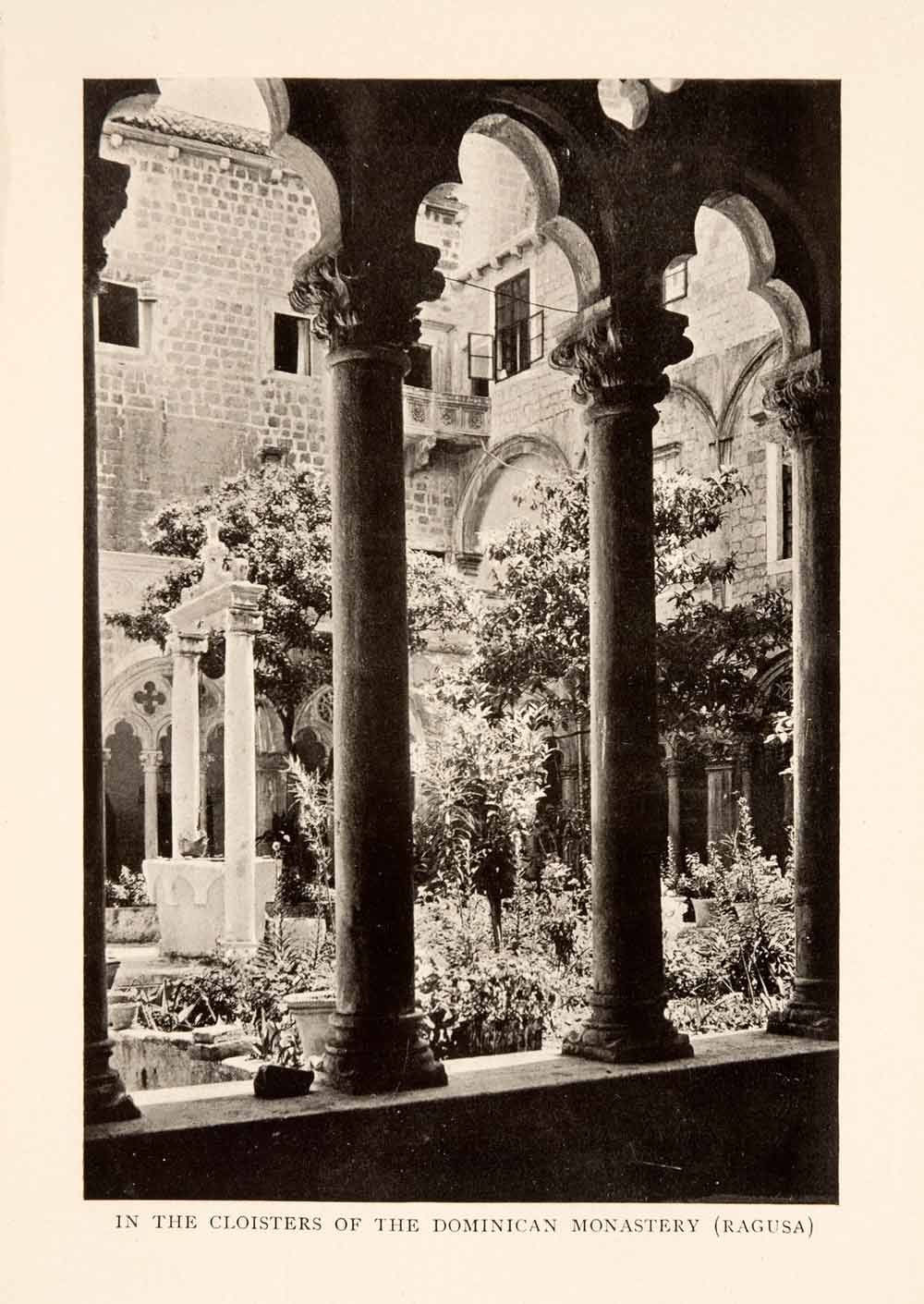 This is an original 1908 black and white halftone print of the cloisters of the Dominican Friary (Monastery) in Dubrovnik (Ragusa), Croatia. This friary was built in the 14th century AD and the cloister was designed in the Gothic style by the Florentine architect Maso di Bartolomeo. Photography by O. Holbach.
