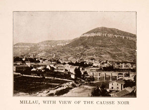 This is an original 1908 sepia halftone print of "Millau, With View of the Causse Noir." Millau is a commune located in the Aveyron department in southern France where the Tarn and Dourbie rivers converge. The Causse Noir is a limestone plateau in the Massif Central area of France.