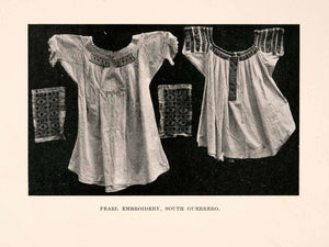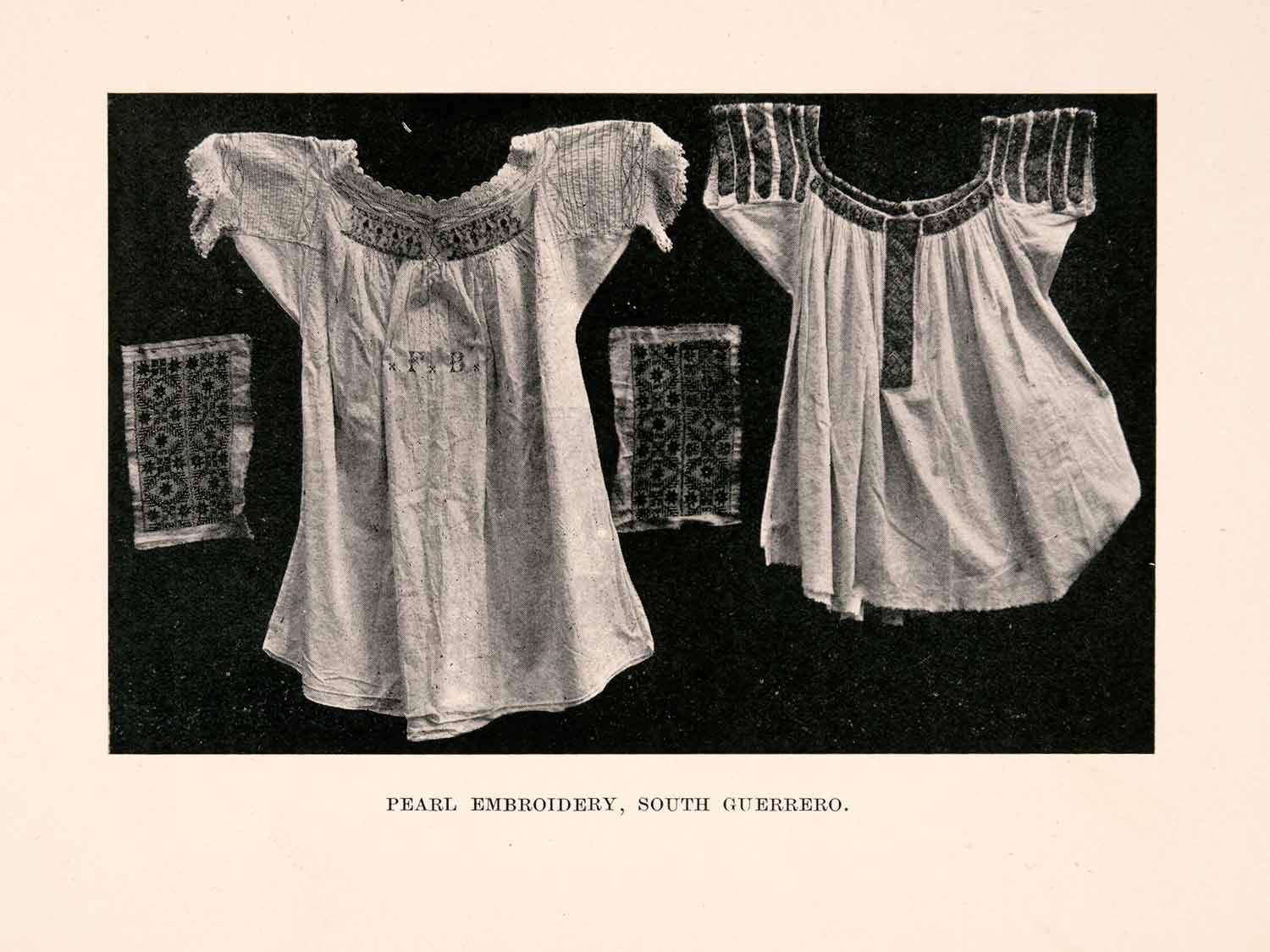 This is an original 1908 black and white halftone print of "Pearl Embroidery, South Guerrero" in Mexico.