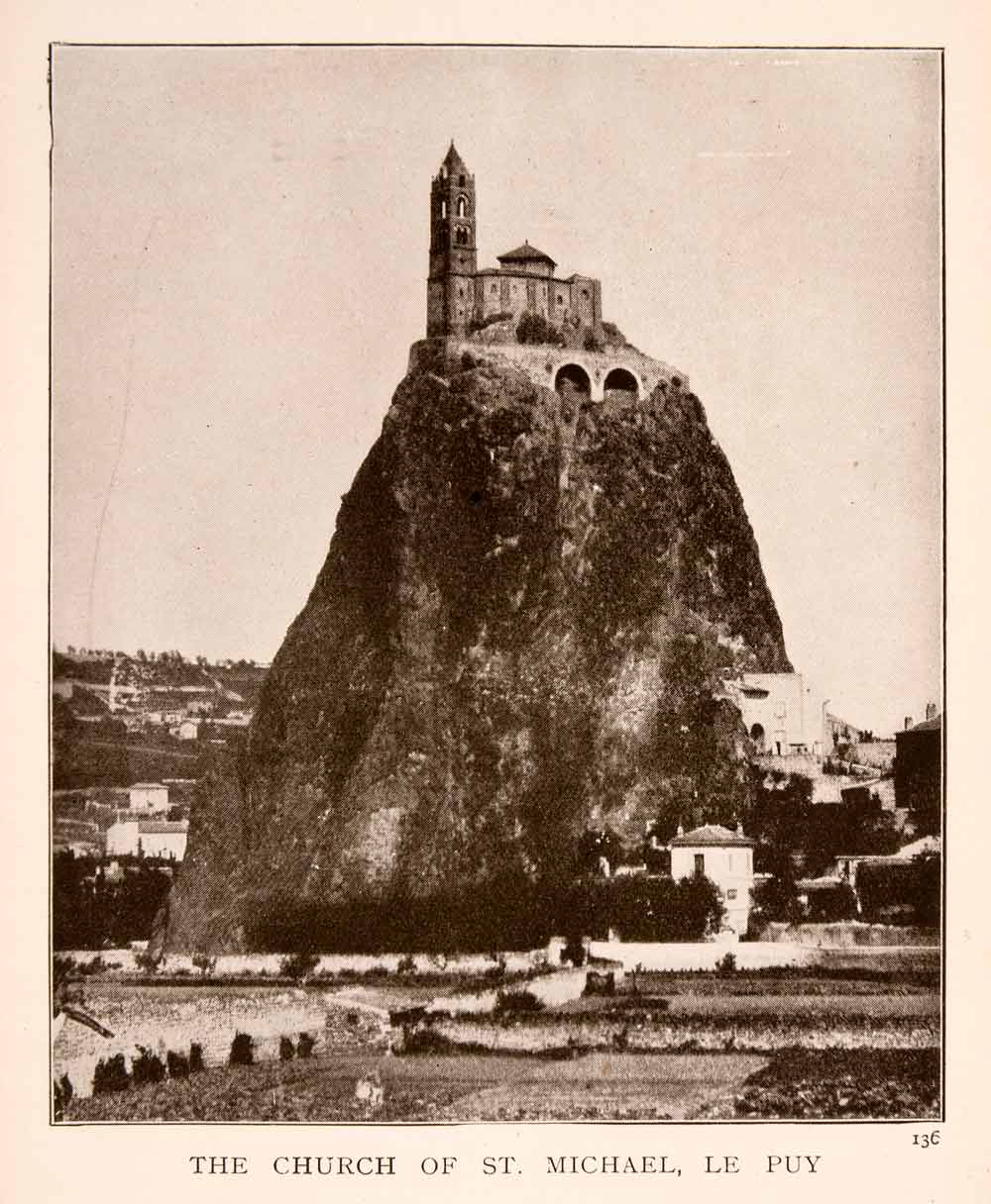 This is an original 1908 sepia halftone print of "The Church of St. Michael, Le Puy." This is an image of Saint Michel d'Aiguilhe, a chapel in Aiguilhe near Le Puy-en-Velay, France. Built to celebrate the return from the pilgrimage of Saint James, the chapel sits on a volcanic formation and is reached by 268 steps carved into the rock.