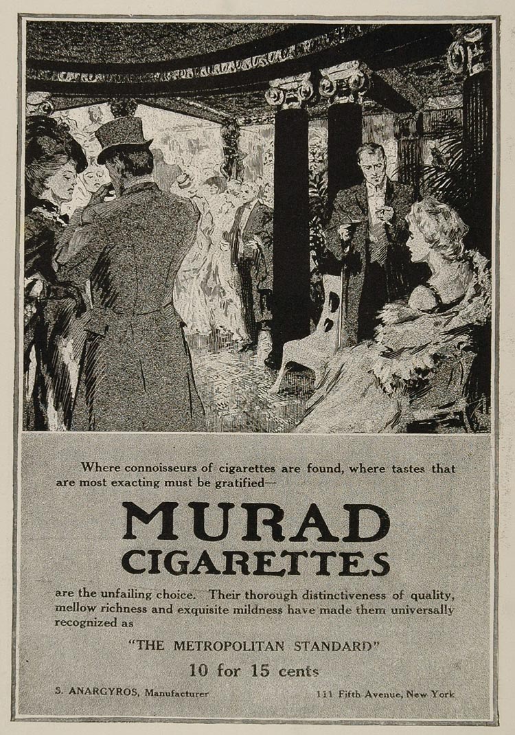 This is an original 1908 black and white print ad for Murad Cigarettes, from the manufacturer, S. Anargyros.