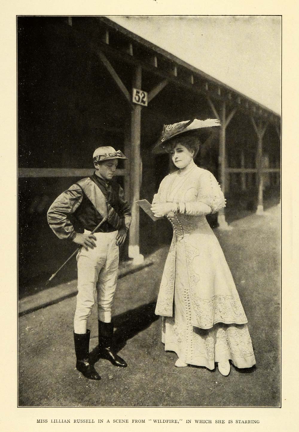 This is an original 1908 halftone print of American actress and singer Lillian Russell in a scene from "Wildfire" with a horse jockey. Russell played the role of Henrietta Barrington in "Wildfire."