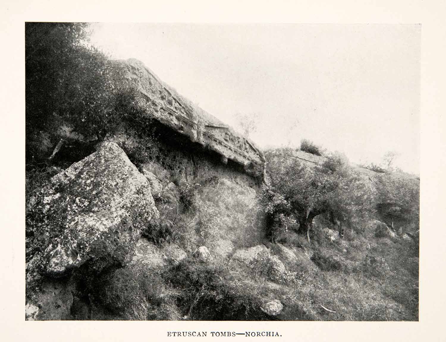 This is an original 1908 black and white halftone print of ancient cliffside Etruscan tombs, carved from the land's natural rock, near Norchia, Italy.