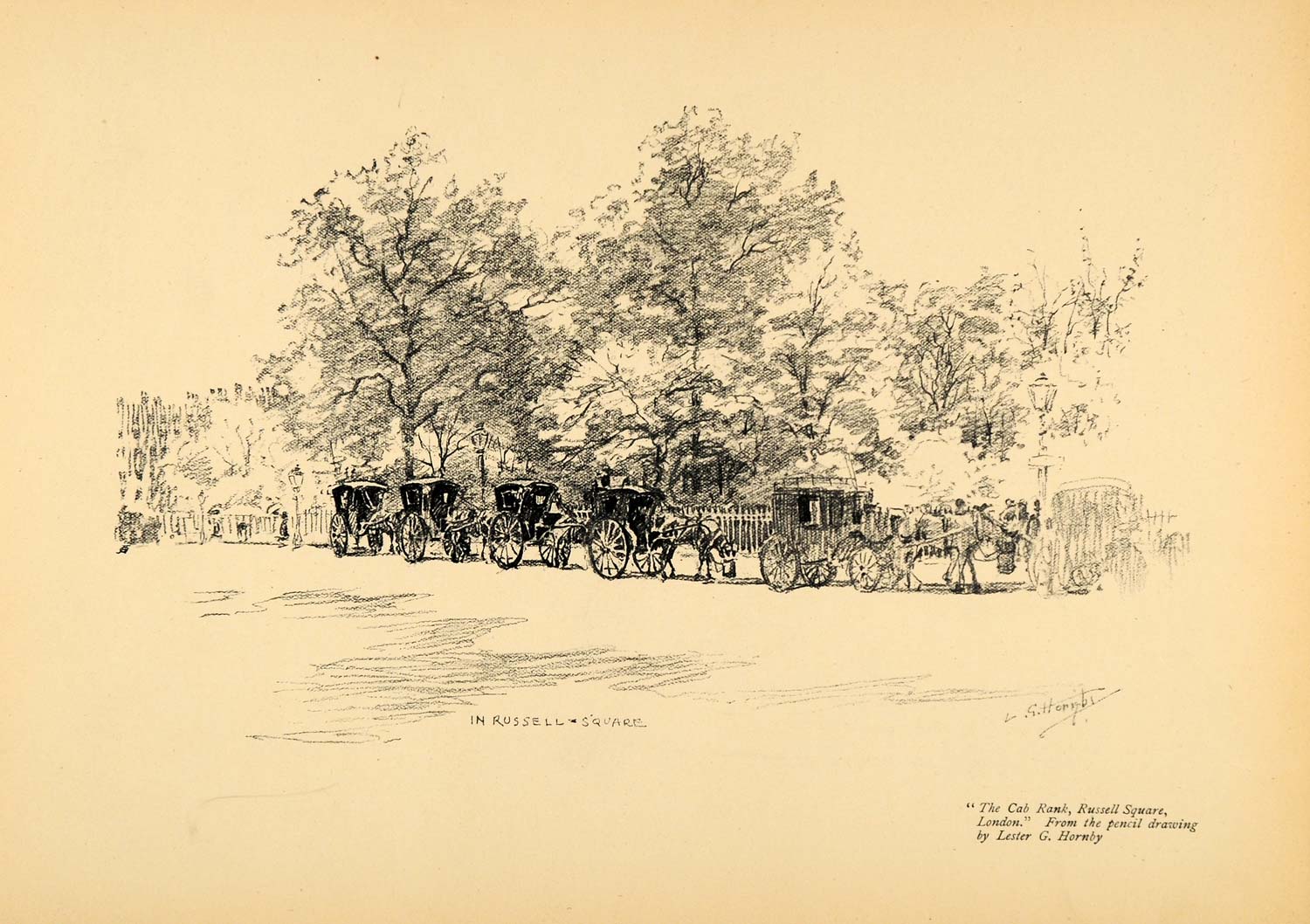 1908 Print Cab Rank Russell Square London Pencil Hornby ORIGINAL HISTORIC INS3