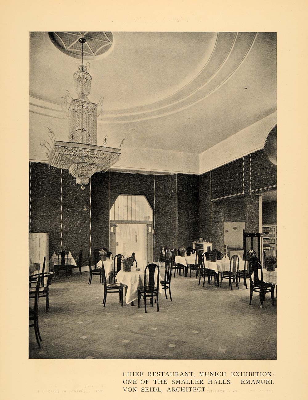 This is an original 1908 halftone print of the Chief Restaurant, Munich Exhibition: One of the Smaller Halls by Emanuel Von Seidl.
