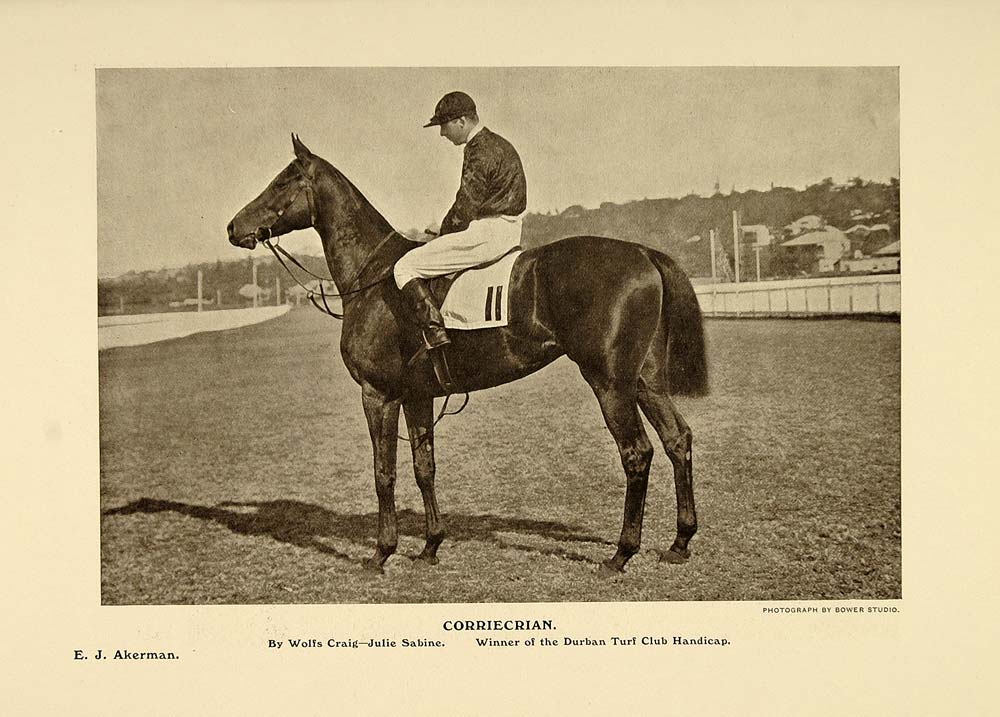 This is an original 1908 print of "Corriecrian," the winner of the Durban Turf Club Handicap horse race in South Africa. Photograph by Bower Studio. E. J. Akerman.