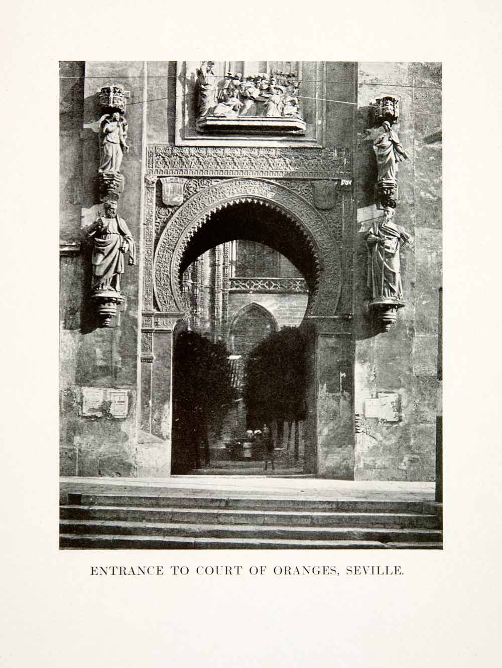 This is an original 1908 black and white halftone print of the entrance to the Court of the Oranges which is part of the Seville Cathedral in Seville, Spain. This part of the building was originally part of the Great Mosque of Seville and was incorporated into the design when the mosque was converted into a church in 1248.