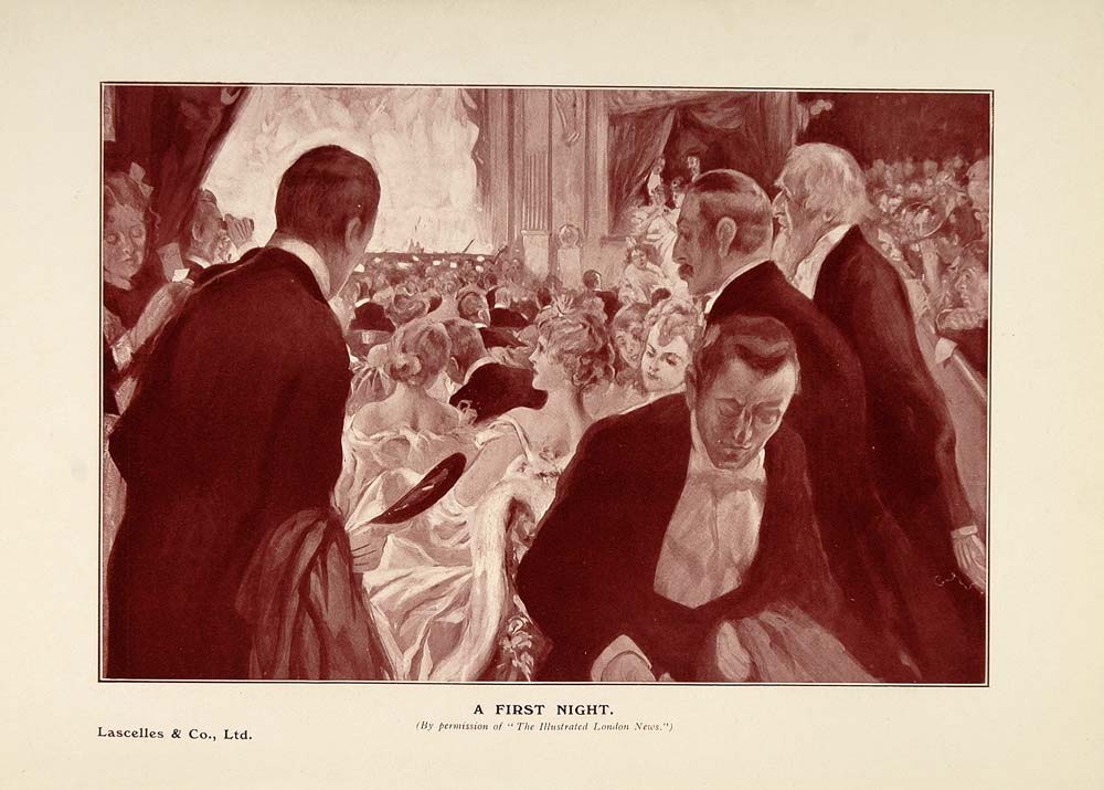 This is an original 1908 print of an opening night audience. Used by permission of The Illustrated London News. Lascelles & Co., Ltd.
