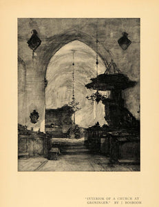 This is an original 1908 halftone print for the Interior of a Church at Groningen. Groningen is the Northeastern most province of the Netherlands. It borders Niedersachsen, Drenthe, Friesland, and the Wadden Sea.