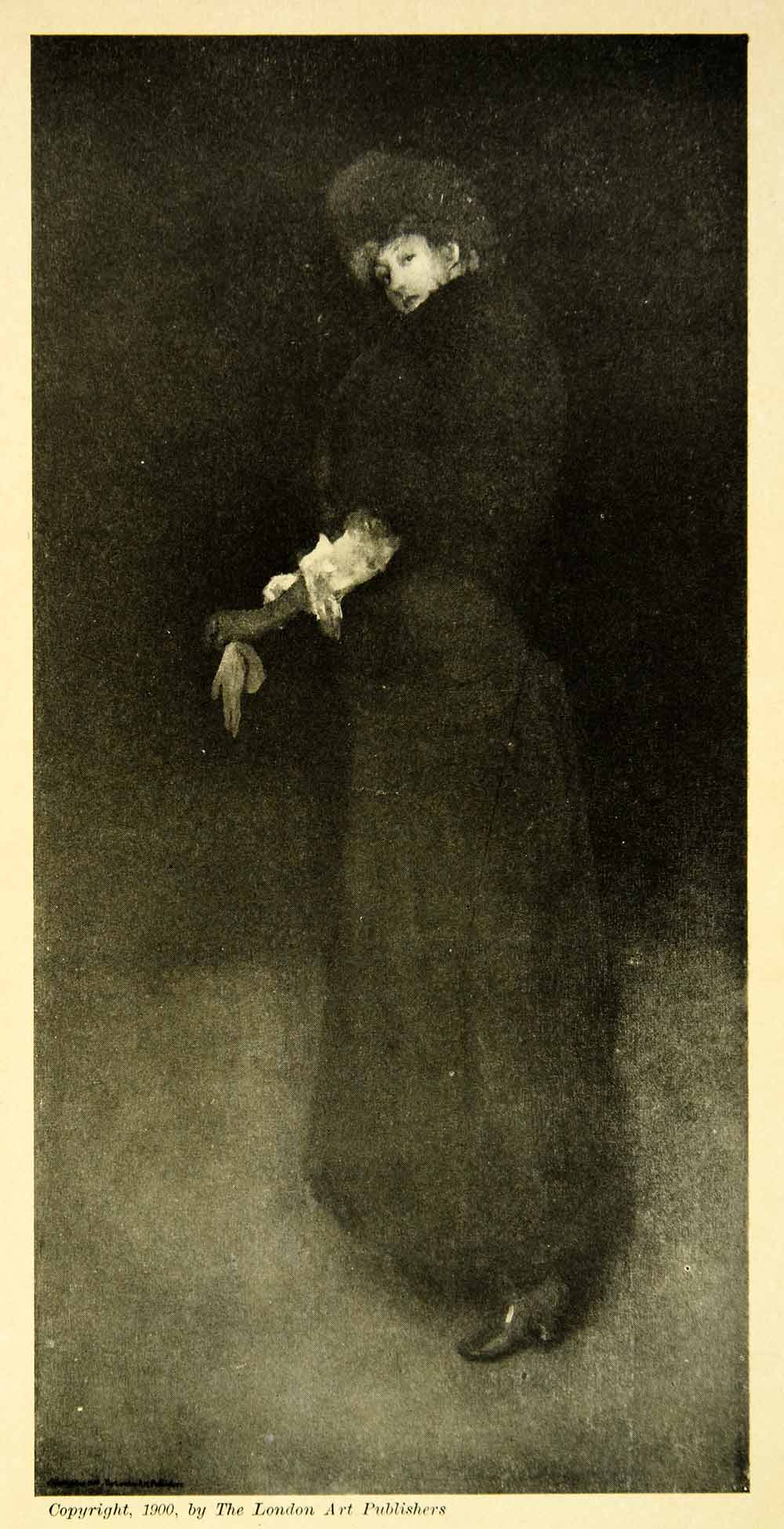 This is an original 1908 two-color halftone print of a Realist style painting by James Abbott McNeill Whistler (1834-1903) entitled "Arrangement in Black: The Lady with the Yellow Buskin" that portrayed Lady Archibald Campbell during the Victorian era.