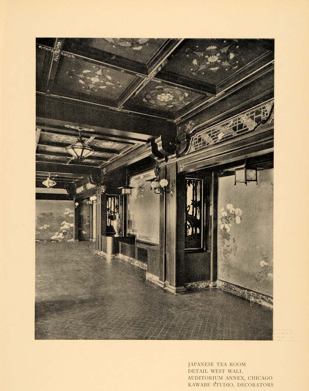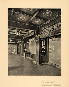 This is an original 1908 halftone print for a Japanese Tea Room decorated by Kawabe Studio and located in the Annex Auditorium in Chicago, Illinois. This picture shows the details of the west wall.