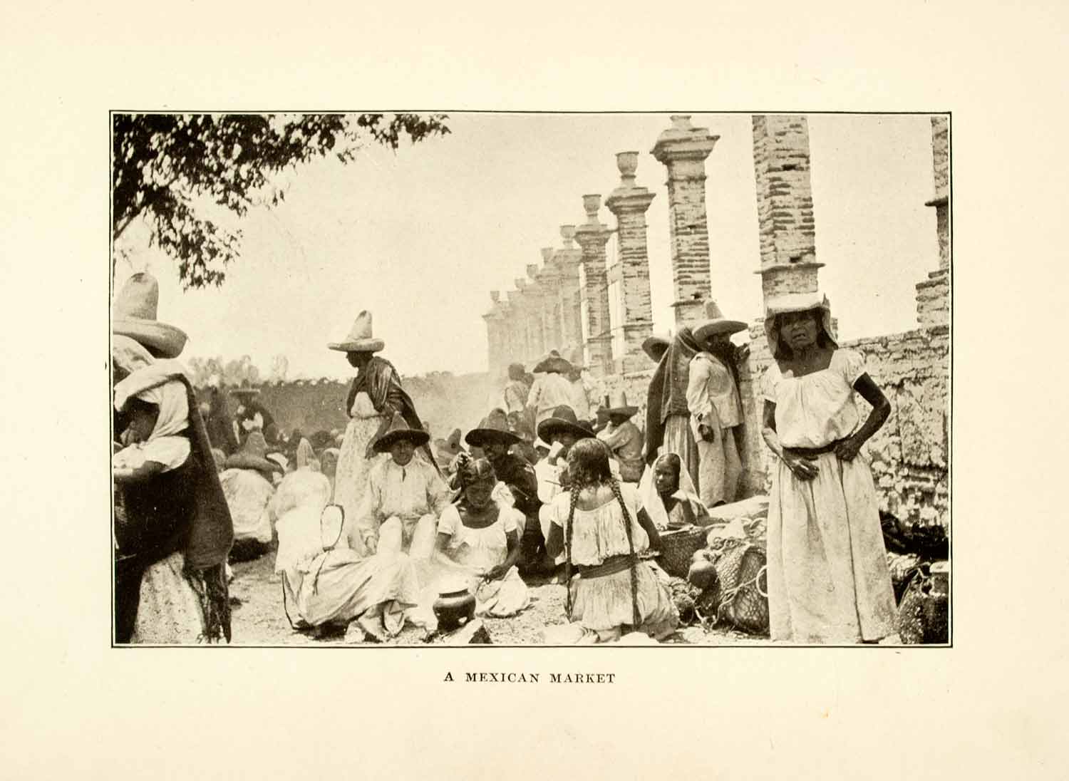 This is an original 1908 black and white halftone print of people in a marketplace in Mexico. Some of the men are wearing sombreros which are traditionally made of straw and the name comes from the word "sombra" which means "shade."