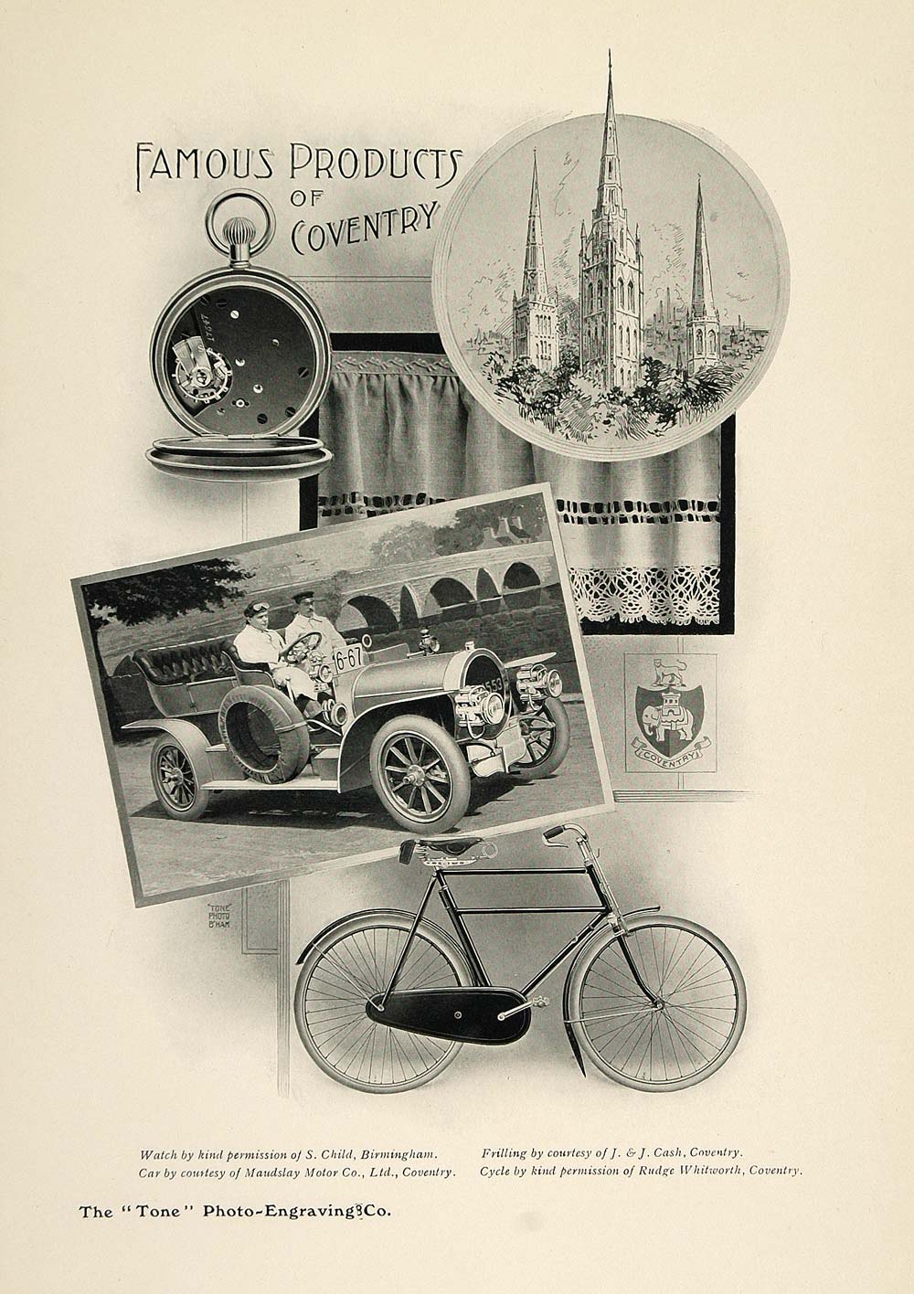 This is an original 1908 print with some of the famous products of Coventry, England: a watch; the Maudslay automobile; frilling by J. & J. Cash; and the Rudge-Whitworth bicycle. The Tone Photo-Engraving Co.