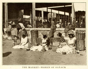 This is an original 1908 black and white halftone print of women sitting in a market in Oaxaca, Mexico. Oaxaca is known for many open air markets throughout the city. Oaxaca is located in southwestern Mexico and the area is known for its indigenous peoples like the Zapotecs and the Mixtecs. The modern state was created in 1824.