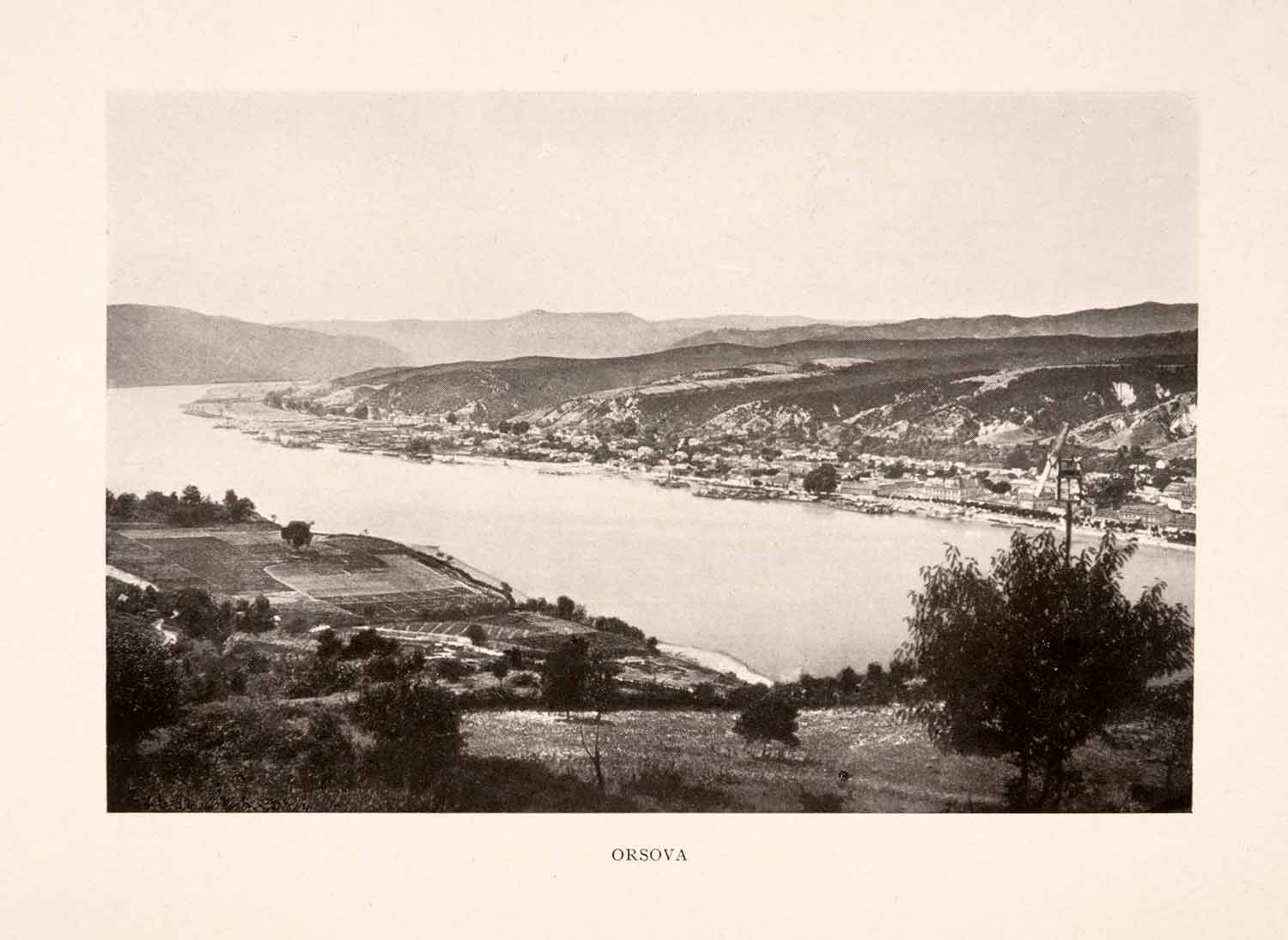 This is an original 1908 black and white halftone print of a bird's eye view of Orsova, Romania.