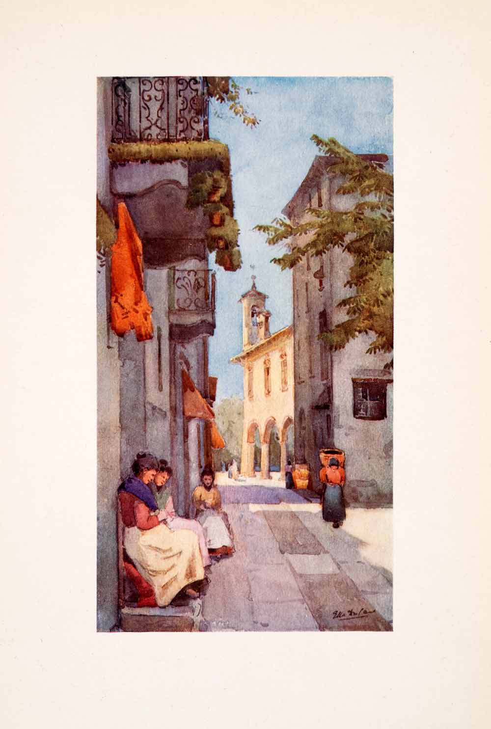 This is an original 1908 color print of a watercolor painting titled, "A Street at Orta."