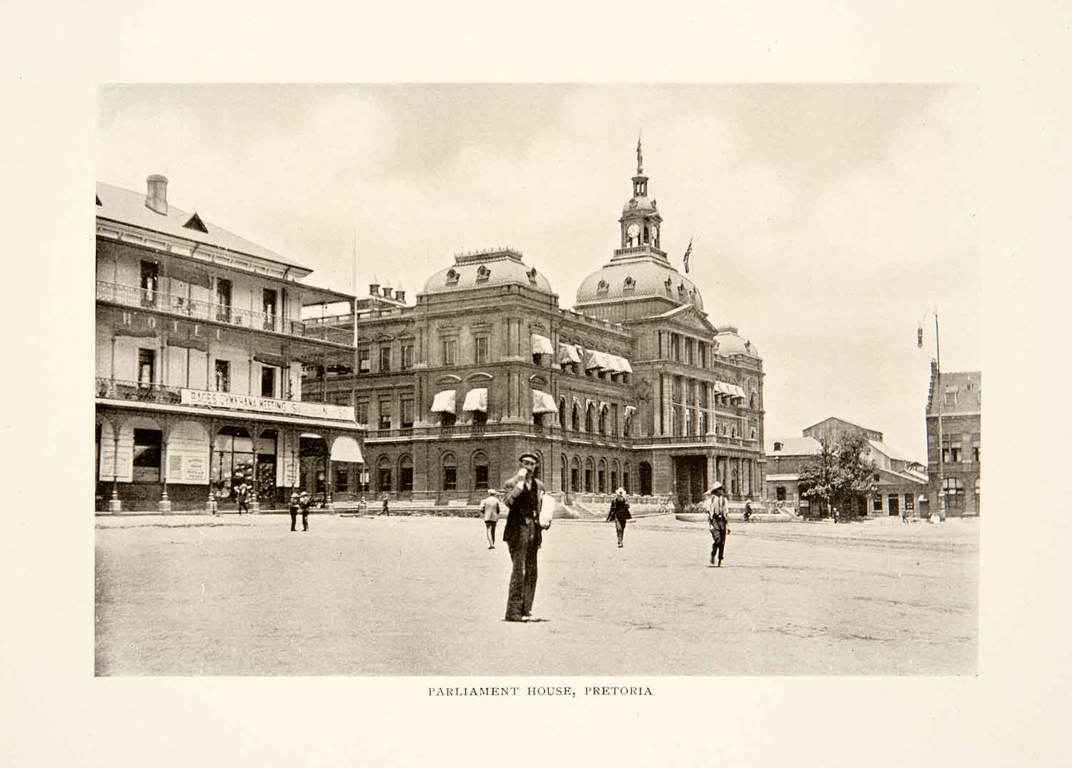 This is an original 1908 black and white halftone print of the "Parliament House, Pretoria," in South Africa.
