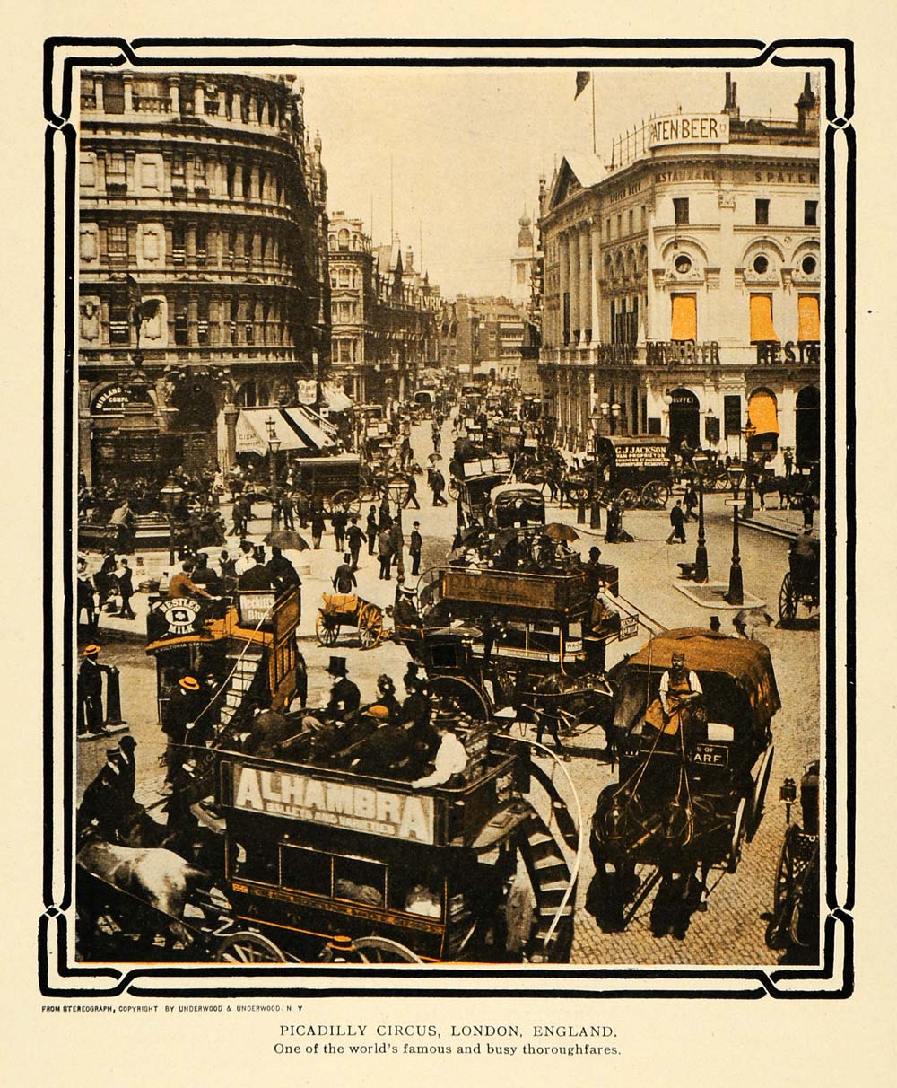 This is an original 1908 duotone print from a stereograph of Piccadilly Circus in London's West End.