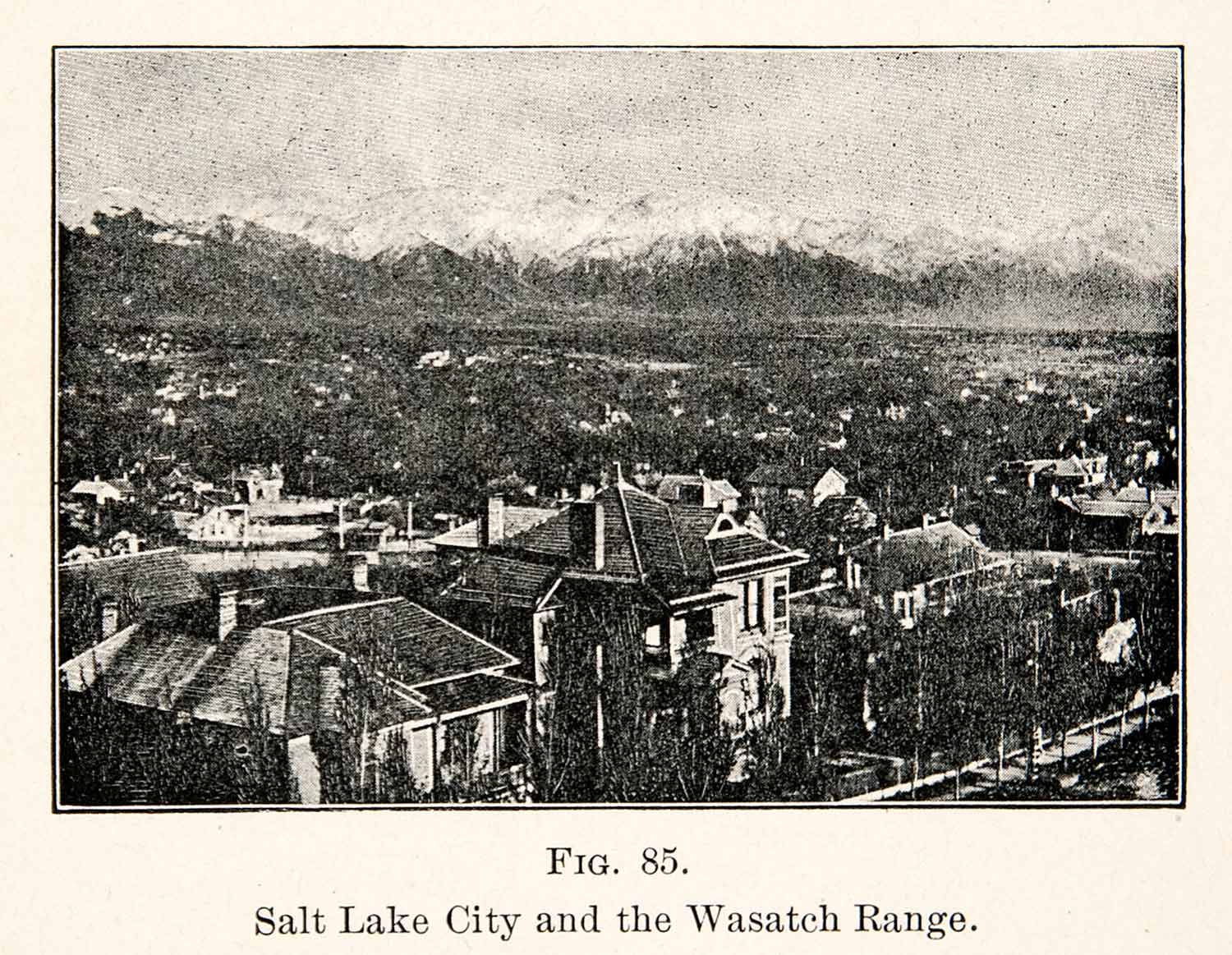 This is an original 1908 black and white halftone print of Salt Lake City, Utah. In the background, you can see the Wasatch Range, which is considered to be the western edge of the Greater Rocky Mountains.