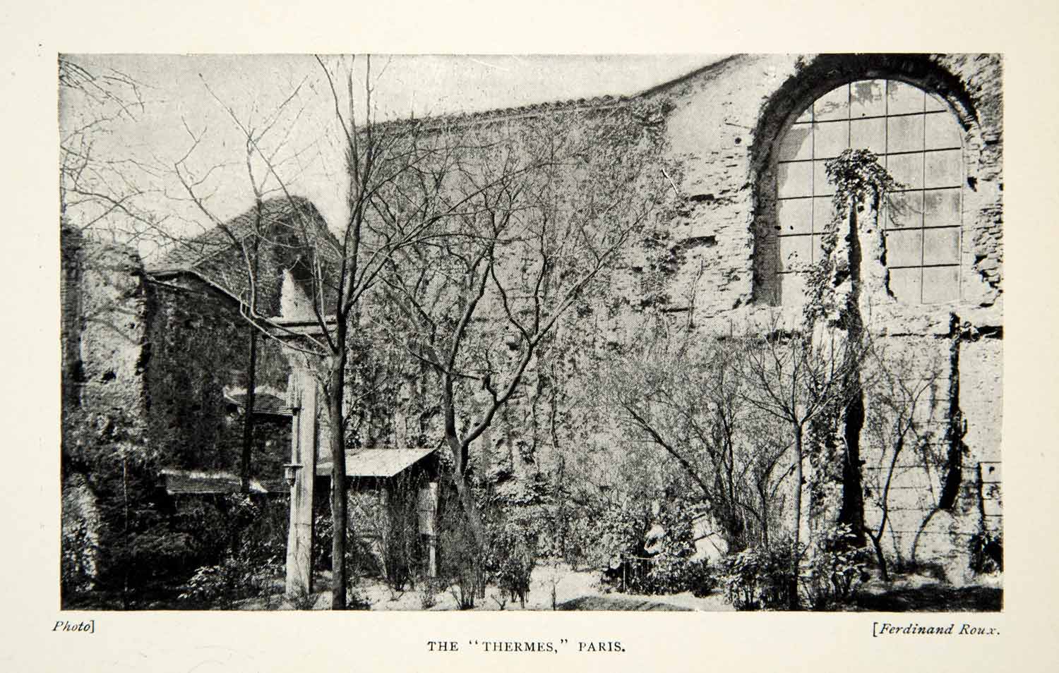 This is an original 1908 black and white halftone print of the Thermes de Cluny, an ancient Gallo-Roman ruin located in the centre of Paris' 5th arrondissement, France.