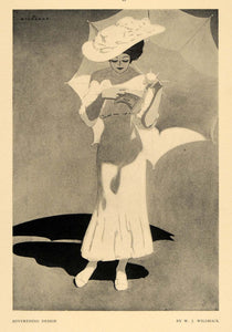 This is an original 1908 halftone print of a women dressed nicely with a lavish hat and umbrella while reading a magazine in the bright sunlight. The shadows work really well for this piece from the shadows from her hat, and her arms and also on the umbrella and ground. The light play is beautiful and makes the piece very interesting.