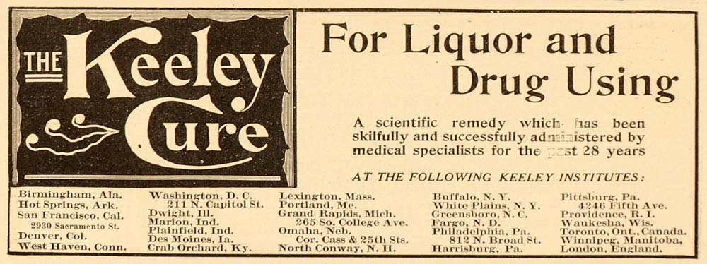 This is an original 1908 black and white print ad for the Keeley Cure for liquor and drug using with a list of Keeley Institutes worldwide.