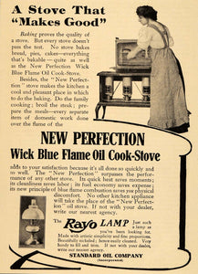 This is an original 1908 black and white print ad for the New Perfection Wick Blue Flame Oil Cook Stove and the Rayo Lamp from the Standard Oil Company.