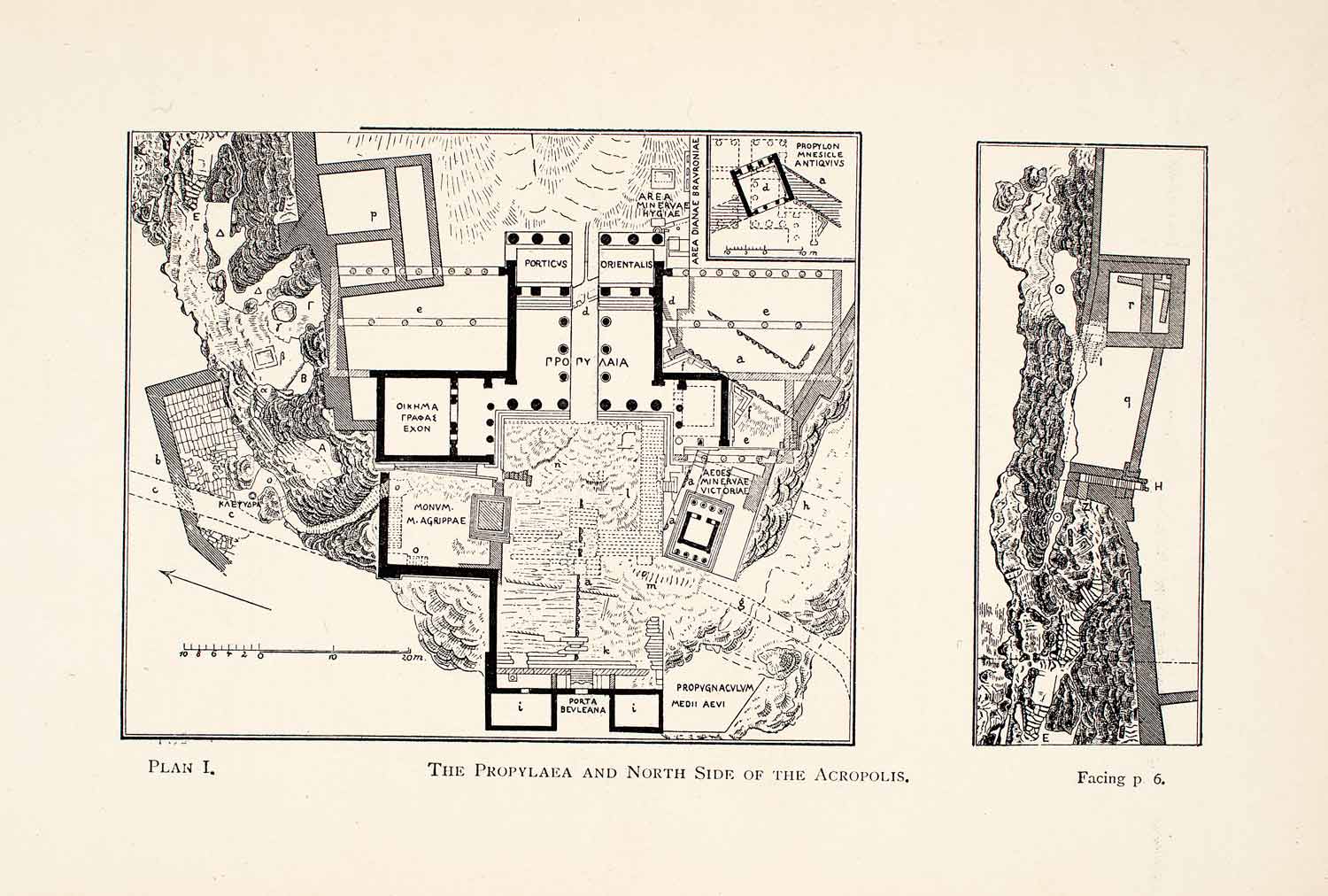 This is an original 1908 black and white in-text wood engraving of a floor plan for the Propylaea at the ruins of the Acropolis in Athens, Greece. The Propylaea is a monumental gateway that is the entrance to the Acropolis.