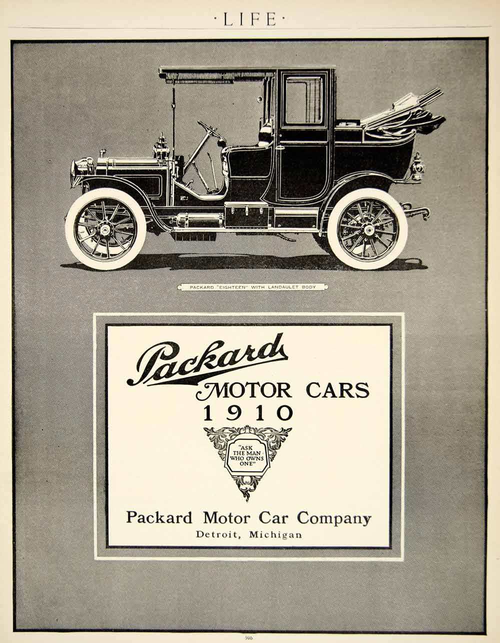 This is an original 1909 black and white print ad for the 1910 Packard Eighteen with a landaulet body style that was made and sold by the Packard Motor Car Company of Detroit, Michigan (MI).