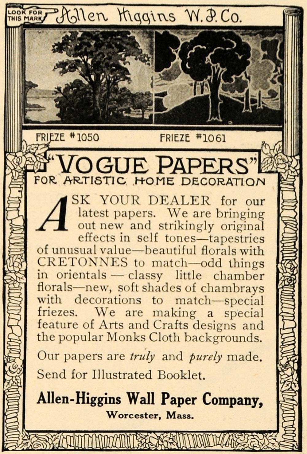 This is an original 1909 black and white print ad for the Vogue Papers for artistic home decoration from Allen-Higgins Wall Paper Company located in Worcester, Massachusetts.