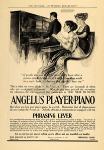 This is an original 1909 black and white print ad for the Angelus Player Piano from The Wilcox and White Company of Meriden, Connecticut. The ad features an image of two ladies singing while a man plays the piano.