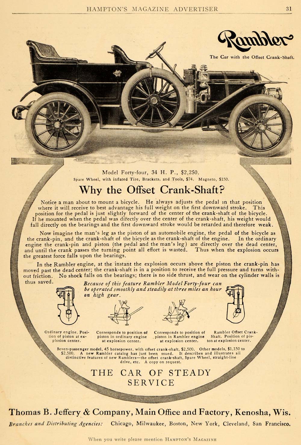 This is an original 1909 black and white print ad for the Rambler Model Forty-Four automobile, a product of Thomas B. Jeffery & Company, located in Kenosha, Wisconsin.