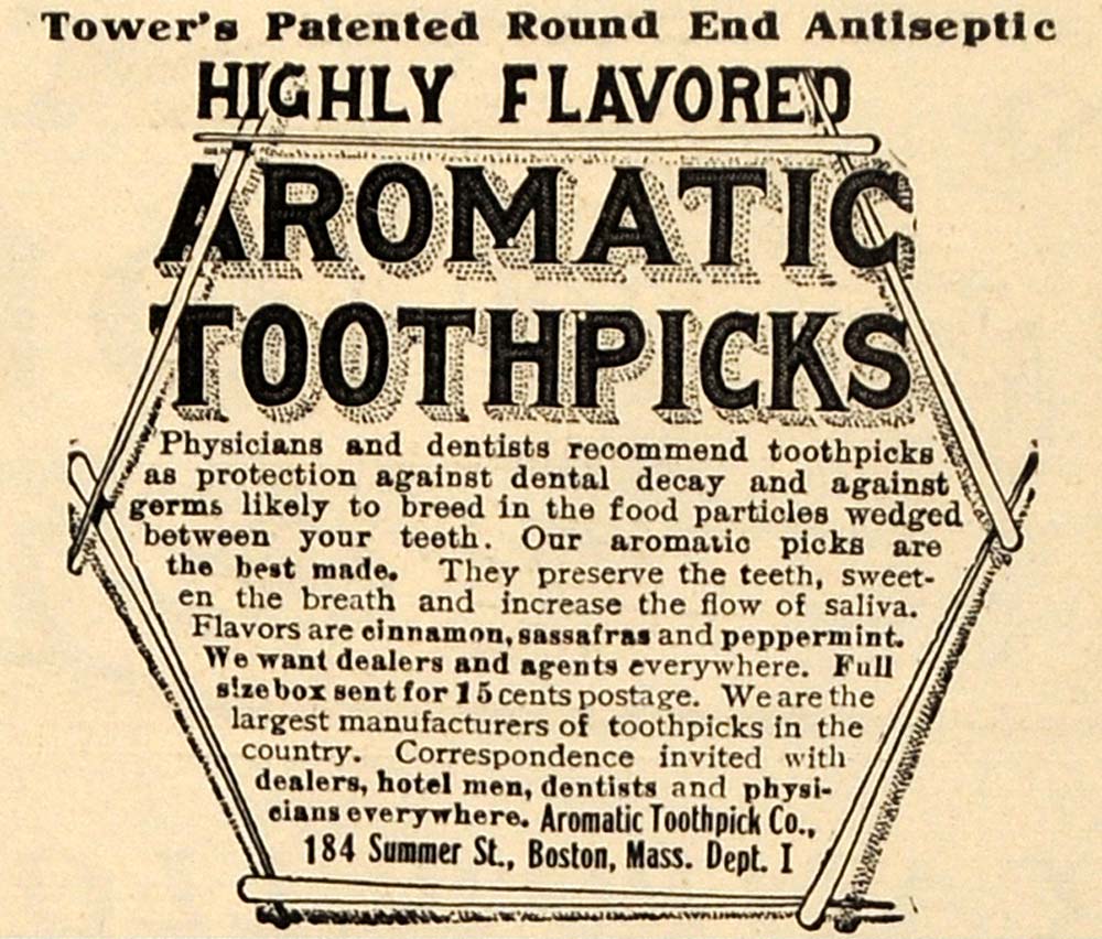 This is a small original 1909 black and white print ad for the Aromatic Toothpicks Company of Boston, Massachusetts. The ad writes, "They preserve the teeth, sweeten the breath and increase the flow of saliva."