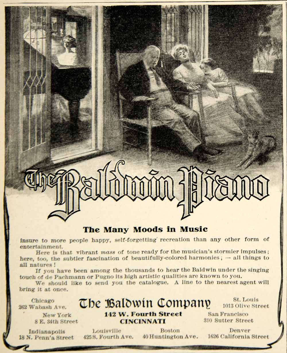 This is an original 1909 black and white print ad for pianos that were made and sold by the Baldwin Company of 142 West Fourth Street in Cincinnati, Ohio (OH).