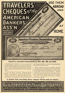 This is an original 1909 black and white print ad for the Travelers' Cheques of the American Bankers' Association from Bankers Trust Company located in New York.